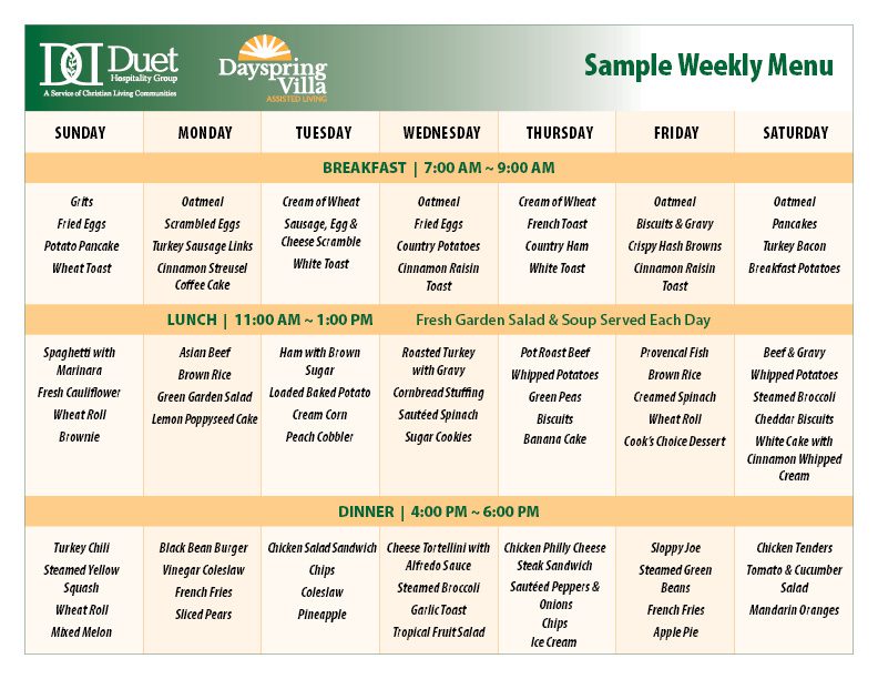 The senior living dining and amenities at Dayspring Villa make our community home. With our partner Duet Hospitality, menus are both fresh and nutritious. Laughter echoes from the community room. The scent of a delicious, freshly prepared meal wafts through the halls. A group of residents embark on a trip to one of the area’s many local attractions. At the end of the day, everyone retreats to the comfort of their private residences and gets ready to do it all again tomorrow.